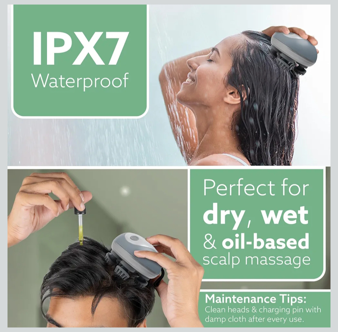 The electric hair scalp massager is powered by rechargeable lithium-ion battery, so no need to plug in while in use. The massage tool comes with a charging base and a power adaptor. It’s compact, cordless portable design allows you to massage anywhere on-the-go.
